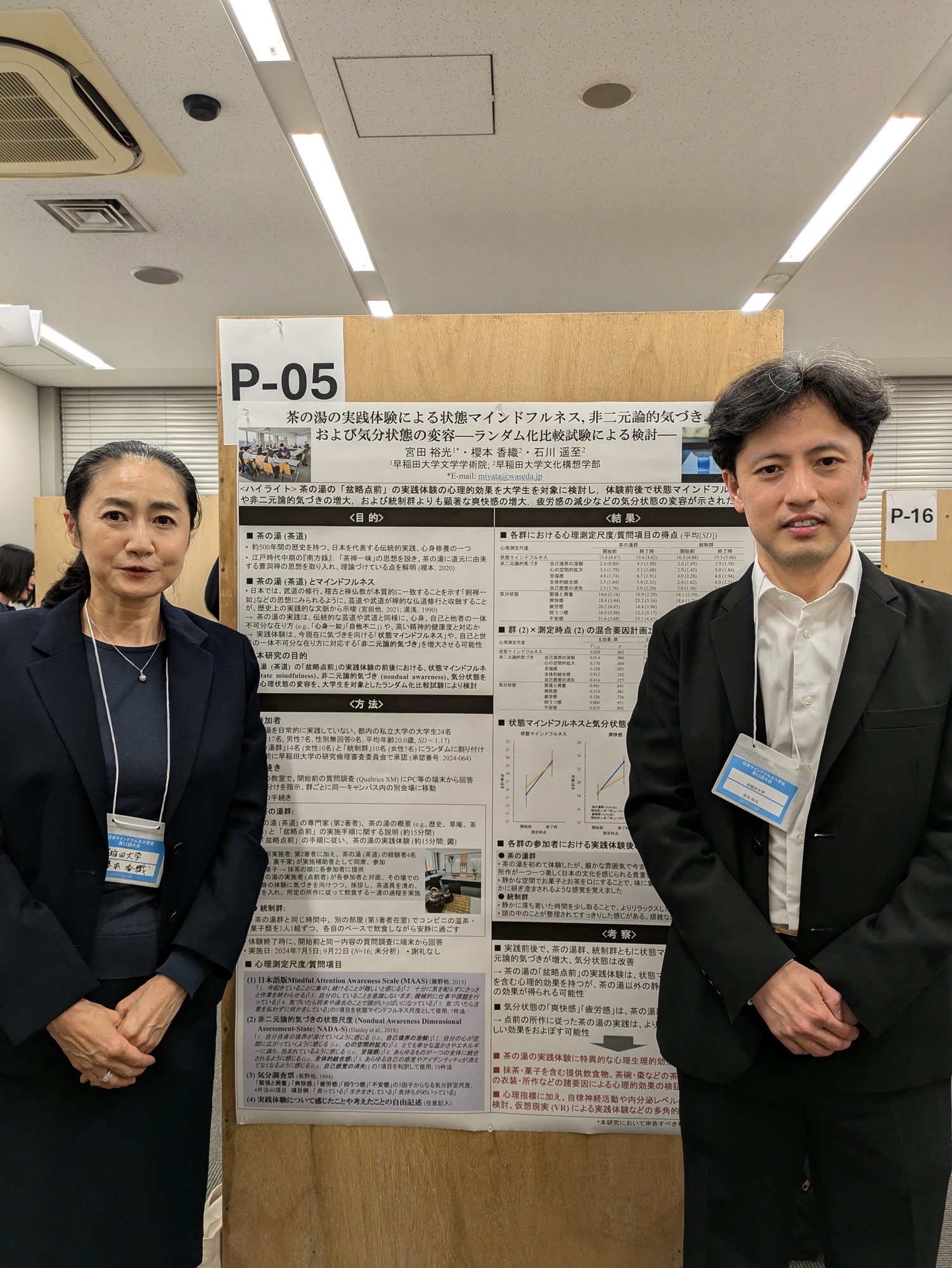 宮田研究室からは、3件のポスター発表を行いました。茶の湯(茶道)についての研究は、東洋哲学がご専門の櫻本先生が2024年度から現代人間論系に着任されたことをきっかけに、最近半年ほどで行ったものです。これまでに、茶の湯の「盆略点前」の体験前後における「状態マインドフルネス (state mindfulness)」や「非二元論的気づき (nondual awareness)」の変化についてのデータが得られました。