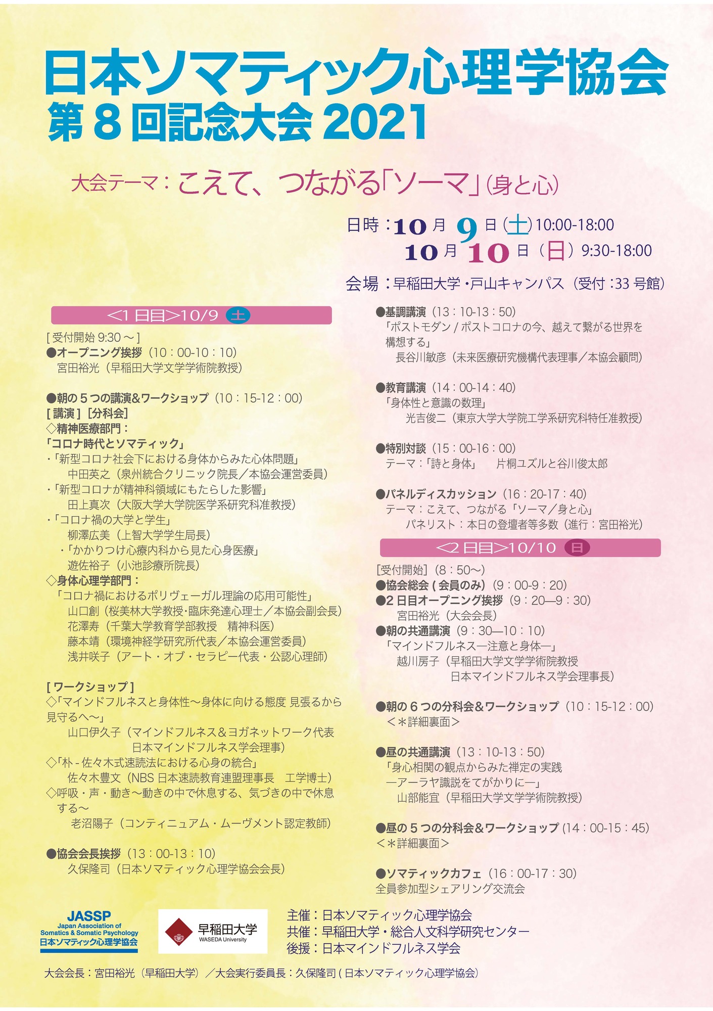 On October 9-10, 2021, The 8th Memorial Meeting of the Japan Association of Somatics & Somatic Psychology was held at Toyama Campus, Waseda Universtiy. Hiromitsu Miyata was the Congress Chair for this meeting.